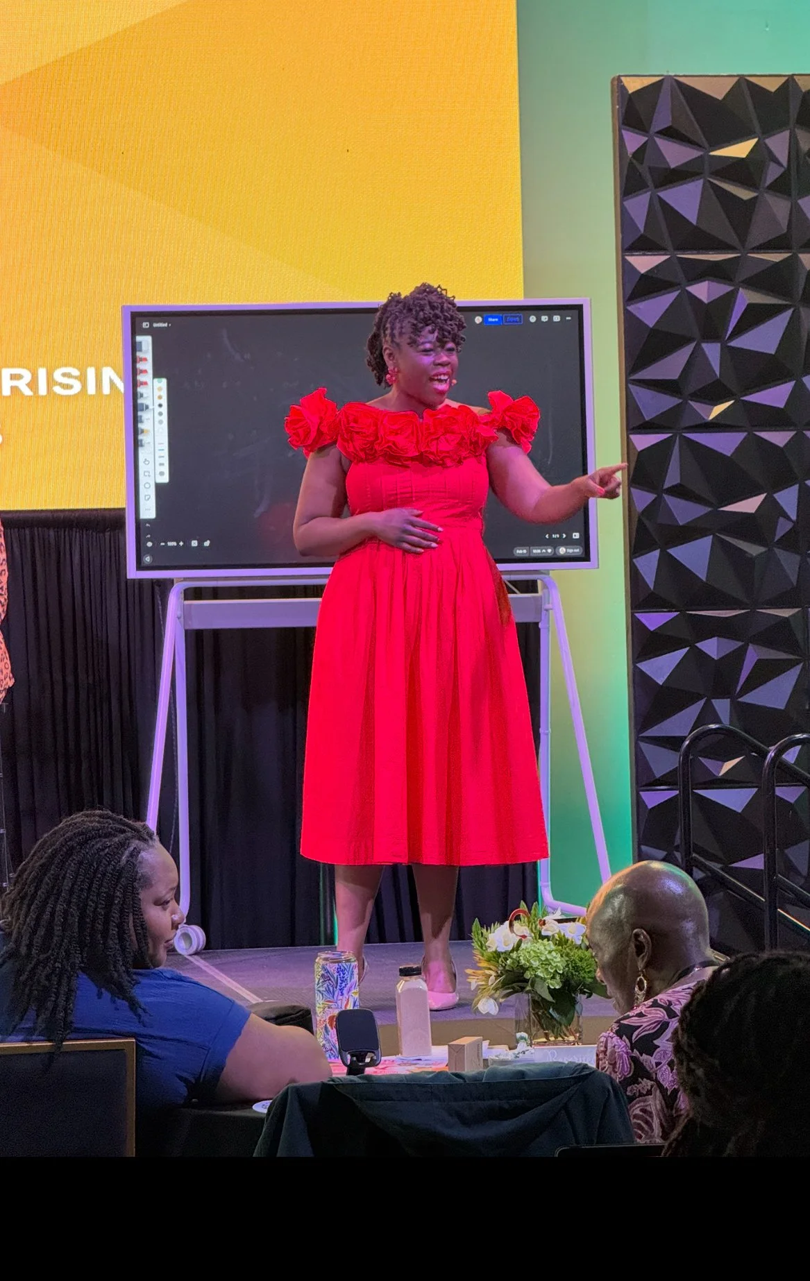 Erin B. Cole in a red dress is standing on stage, emceeing an event, with a large screen behind her and decorative panels on the side.